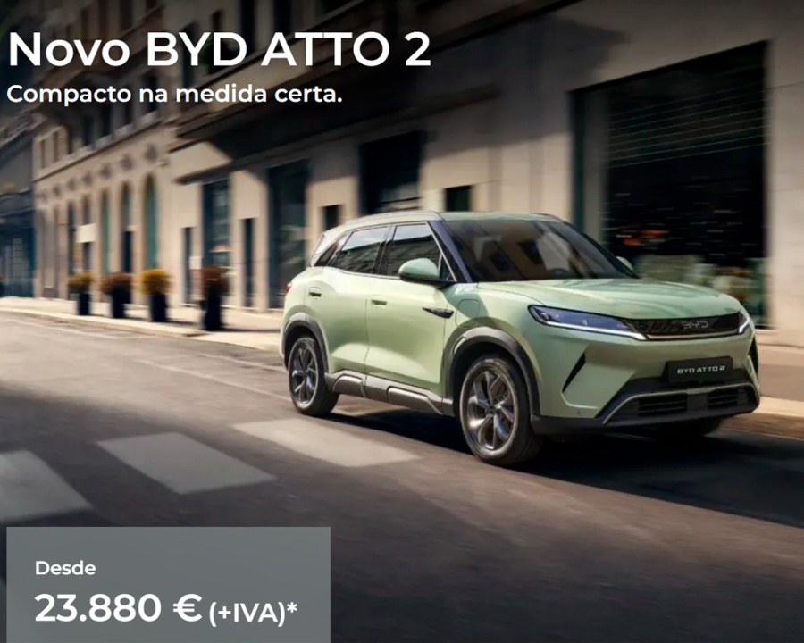 *PVP referente ao modelo BYD ATTO 2 versão Active, em vigor até 31/01/2026 nos concessionários BYD aderentes e limitado ao stock existente. Valor não inclui despesas de legalização e transporte nem custos adicionais de pintura. Acresce IVA à taxa legal em vigor. Imagem não contratual. WLTP: Consumo de energia em kWh/100 km (combinado): 16; Autonomia Elétrica em km (combinado-urbano): 312-463. Emissões de CO2 em g/km: 0.