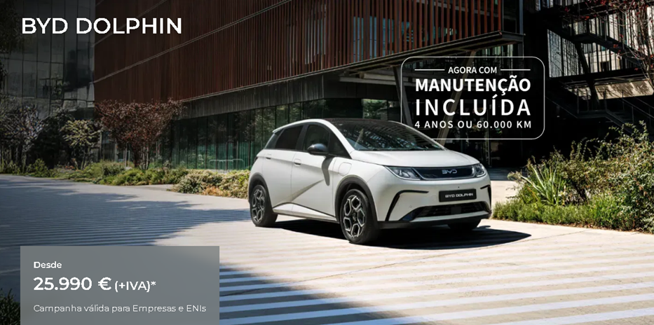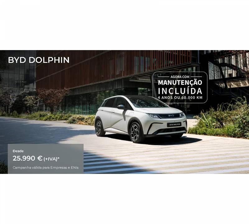 *PVP referente ao modelo BYD DOLPHIN versão Comfort, em vigor até 31/01/2026 nos concessionários BYD aderentes e limitado ao stock existente. Campanha exclusiva para Empresas e ENIs. Valor não inclui despesas de legalização, transporte e custos adicionais de opção de pintura. Imagem não contratual. Consumo de energia em kWh/100 km (combinado): 15,9; Autonomia Elétrica em km (combinado-urbano): 427-559. Emissões de CO2 em g/km: 0.