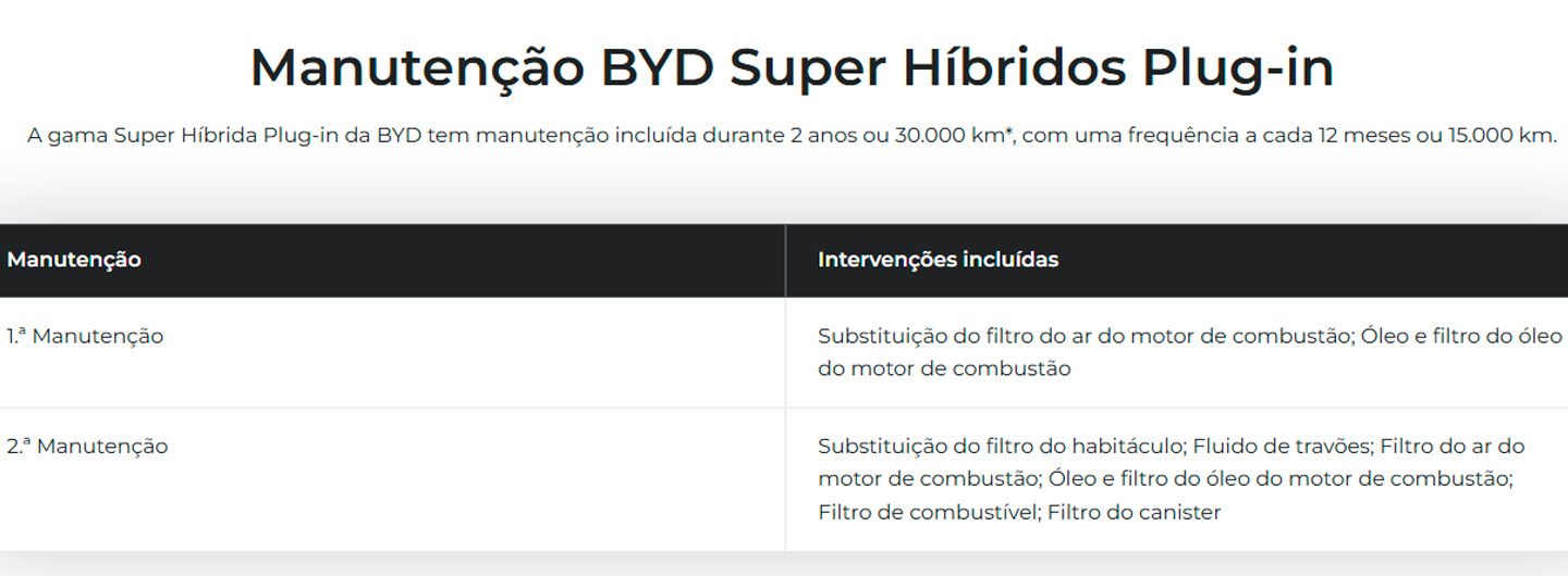 *A Manutenção Programada da BYD é aplicável aos veículos ligeiros de passageiros matriculados a partir de 1 de outubro de 2025, vendidos à data de matrícula por um concessionário autorizado da rede Oficial BYD em Portugal a um consumidor final. A Manutenção Programada da BYD é válida exclusivamente para manutenções programadas preconizadas pelo fabricante, a realizar em Reparadores Autorizados BYD em território nacional, até ao limite de 48 meses ou 60.000km, o que ocorrer primeiro, para veículos 100% elétricos, ou até ao limite de 24 meses ou 30.000km, o que ocorrer primeiro, para veículos híbridos plug-in, contados a partir da data de primeira matrícula do veículo. A oferta exclui quaisquer intervenções, reparações ou peças adicionais fora do programa definido pelo fabricante.