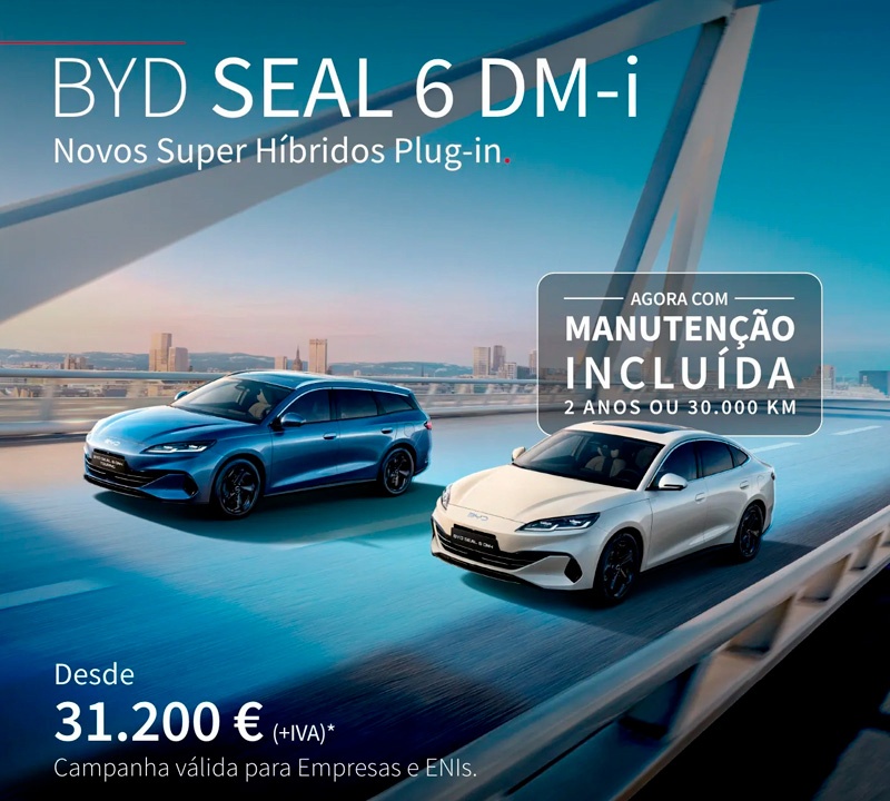 *PVP referente ao modelo BYD SEAL 6 DM-i versão Comfort, em vigor até 30/04/2026 nos concessionários BYD aderentes e limitado ao stock existente. Campanha exclusiva para Empresas e ENIs. Valor não inclui despesas de legalização e transporte nem custos adicionais de opção de pintura. Imagem não contratual. WLTP: Consumo de energia em ciclo combinado (kWh/100 km): 15,5 - 16,4; Consumo de combustível em ciclo combinado (l/100 km): 4,8 - 5; Consumo ponderado em ciclo combinado (l/100 km): 1,5 - 1,7; Autonomia elétrica em ciclo combinado (km): 100 - 105; Autonomia total (elétrico + combustível): 1350 - 1455 km; Emissões de CO2 em ciclo combinado (g/km): 34 – 38.