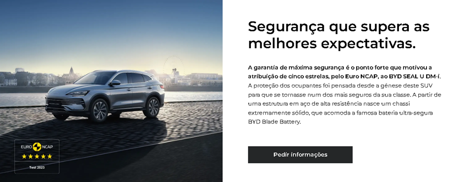 *PVP referente ao modelo BYD SEAL U DM-i versão Boost, em vigor até 31/01/2026 nos concessionários BYD aderentes e limitado ao stock existente. Valor não inclui despesas de legalização, transporte e custos adicionais de opção de pintura. Acresce IVA à taxa legal em vigor. Imagem não contratual. WLTP: Consumo de energia em ciclo combinado (kWh/100 km): 17,9 - 23,5; Consumo de combustível em ciclo combinado (l/100 km): 5,6 - 7,4; Consumo ponderado em ciclo combinado (l/100 km): 0,4 - 1,2; Autonomia elétrica em ciclo combinado (km): 70 - 125; Autonomia total (elétrico + combustível): 870 - 1125 km; Emissões de CO2 em ciclo combinado (g/km): 9 – 26.