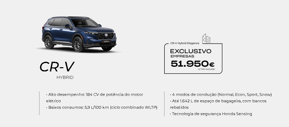 Preço exclusivo para empresas e ENIs para modelo Honda CR-V e:HEV Elegance, incluindo despesas de legalização, transporte, pintura metalizada e ecovalor. Limitado ao stock existente nos concessionários aderentes no continente. Para as ilhas, acresce o custo de transporte marítimo. Imagem não contratual. Condições válidas para unidades em stock abrangidas pela campanha até 31 de março de 2026. As imagens e equipamentos apresentados são meramente ilustrativos e podem não corresponder às versões em campanha ou comercializadas em Portugal. Consumos em ciclo combinado (l/100 km): 5.9 L. Emissões CO2 (g/km): 134.