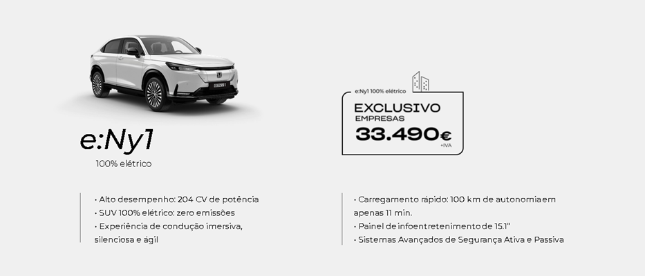 Preço exclusivo para empresas e ENIs para modelo Honda e:Ny1 EV, incluindo despesas de legalização, transporte, pintura metalizada e ecovalor. Limitado ao stock existente nos concessionários aderentes no continente. Para as ilhas, acresce o custo de transporte marítimo. Imagem não contratual. Condições válidas para unidades em stock abrangidas pela campanha até 31 de março de 2026. As imagens e equipamentos apresentados são meramente ilustrativos e podem não corresponder às versões em campanha ou comercializadas em Portugal. Autonomia (WLTP Ciclo combinado): 412 km. Emissões CO2 (g/km): 0.