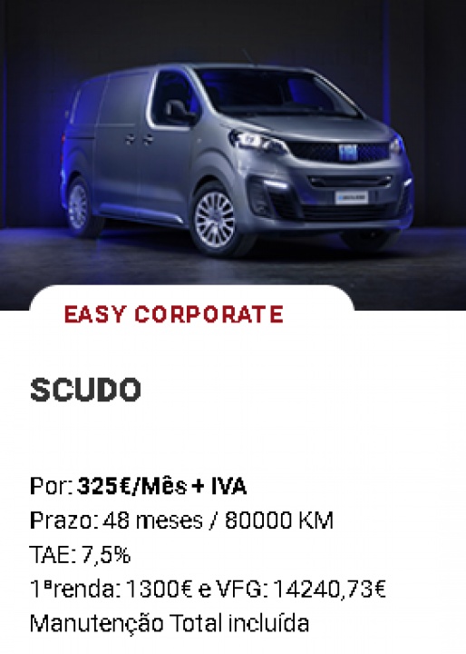 Informação Legal: Contrato de ALD automóvel, novos, para 48 meses, exemplo para Novo Fiat Scudo, PVPR de 33.987,43€, PVP campanha de 27.899,08€, inclui DLTP, primeira renda de 1300€, 47 prestações de 367€, valor residual de 14.240,73€. Acresce 4,25€ de comissão cobrança de renda. Acresce 26,68€ relativos ao serviço de manutenção da marca. Taxa fixa, TAN de 5,950% e TAE de 7,5% (inclui comissão de abertura de contrato de 700€, de reconhecimento e envio da declaração de extinção de reserva de 75€). Válido para clientes Empresas até 31 de Janeiro de 2026. Exclusivo com Financiamento Stellantis Financial Services, uma marca Santander Consumer Finance, Sucursal em Portugal (registado junto do BdP com o nº 0073). A FCA Portugal, S.A. registada no Banco de Portugal sob o nº 7205 como intermediário de crédito a título acessório, actua sem caracter de exclusividade.
