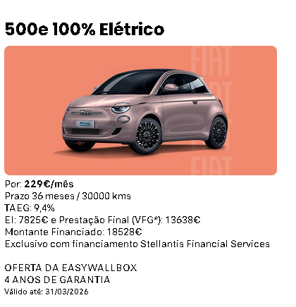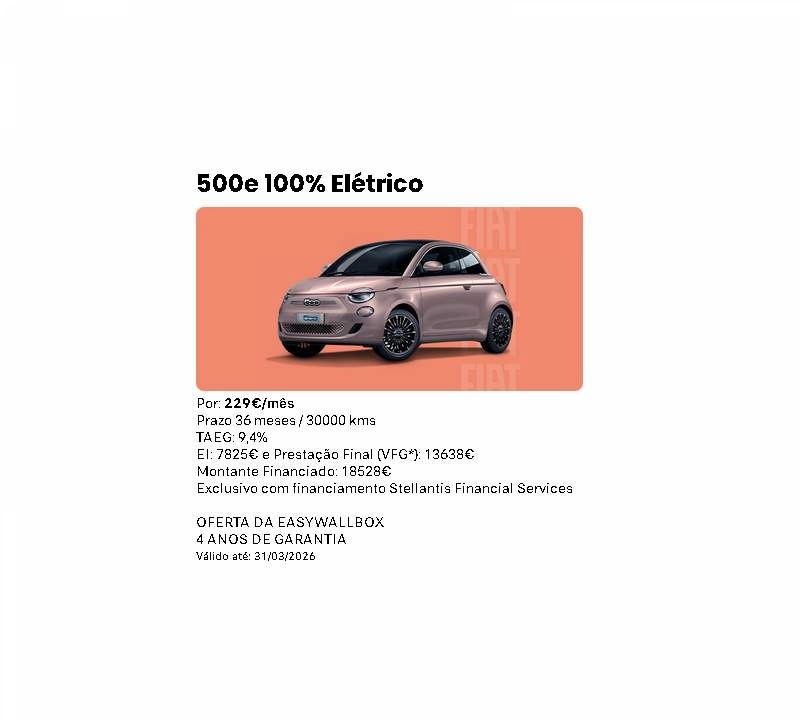 Condições legais: Contrato de crédito automóvel novos para 36 meses / 30.000 km, exemplo para 500e Elétrico Berlina 118cv | Bateria 42 kWh Pop, PVPR de 28.853,00€, PVP campanha de 26.353,00€, inclui DLTP, entrada inicial de 7.825€, montante financiado de 18.528,00€, 35 prestações de 229€, prestação final de 13.637,97€, taxa fixa, TAN de 6,202% e TAEG de 9,4% para um MTIC de 22.780,96€. (Inclui comissão de abertura de contrato de 700€, de reconhecimento e envio da declaração de extinção de reserva de 75€ e 32,50€ de custo de extinção de reserva). Condições válidas até 31/03/2026, para clientes particulares. Financiado por Stellantis Financial Services, uma marca Santander Consumer Finance, S.A, Sucursal em Portugal (registado junto do BdP com o nº 0073). A FCA Portugal, S.A. registada no Banco de Portugal sob o nº 7205 como intermediário de crédito a título acessório, actua sem caracter de exclusividade. Informe-se no Santander Consumer Finance S.A. *Valor Final Garantido, condicionado ao cumprimento de condições.Limitado ao stock existente.Ciclo combinado WLTP: Consumos de energia de 13 a 14,4 kWh/100km, emissões de CO2 de 0 g/km e autonomia em ciclo combinado de 190 a 331 km. Os valores reais de consumo e CO2 dependem de muitos fatores associados, como, a título exemplificativo, estilo de condução, percurso e equipamento do veículo.