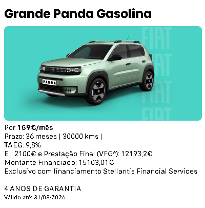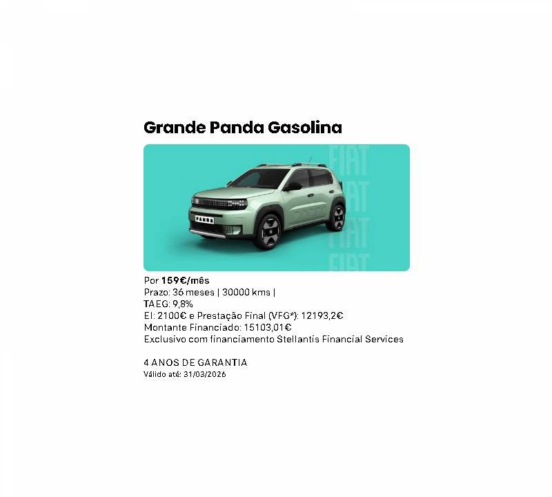 Contrato de crédito automóvel novos para 36 meses / 30.000 km, exemplo para Grande Panda 1.2 100cv MT POP, PVPR de 19.203,01€, PVP campanha de 17.203,01€, inclui DLTP, entrada inicial de 2.100€, montante financiado de 15.103,01€, 35 prestações de 159€, prestação final de 12.193,19€, taxa fixa, TAN de 6,200% e TAEG de 9,8% para um MTIC de 18.786,40€. (Inclui comissão de abertura de contrato de 700€, de reconhecimento e envio da declaração de extinção de reserva de 75€ e 32,50€ de custo de extinção de reserva). Condições válidas até 31/03/2026, para clientes particulares. Financiado por Stellantis Financial Services, uma marca Santander Consumer Finance, S.A, Sucursal em Portugal (registado junto do BdP com o nº 0073). A FCA Portugal, S.A. registada no Banco de Portugal sob o nº 7205 como intermediário de crédito a título acessório, actua sem caracter de exclusividade. Informe-se no Santander Consumer Finance S.A. *Valor Final Garantido, condicionado ao cumprimento de condições.Ciclo combinado WLTP: Consumo de combustível: 5,6-5,7 l/100 km; Emissões de CO2: 128-130 g/km. Valores de homologação determinados com base no ciclo combinado WLTP. Os valores reais de consumo e CO2 dependem de muitos fatores associados, como, a título exemplificativo, estilo de condução, percurso e equipamento do veículo.