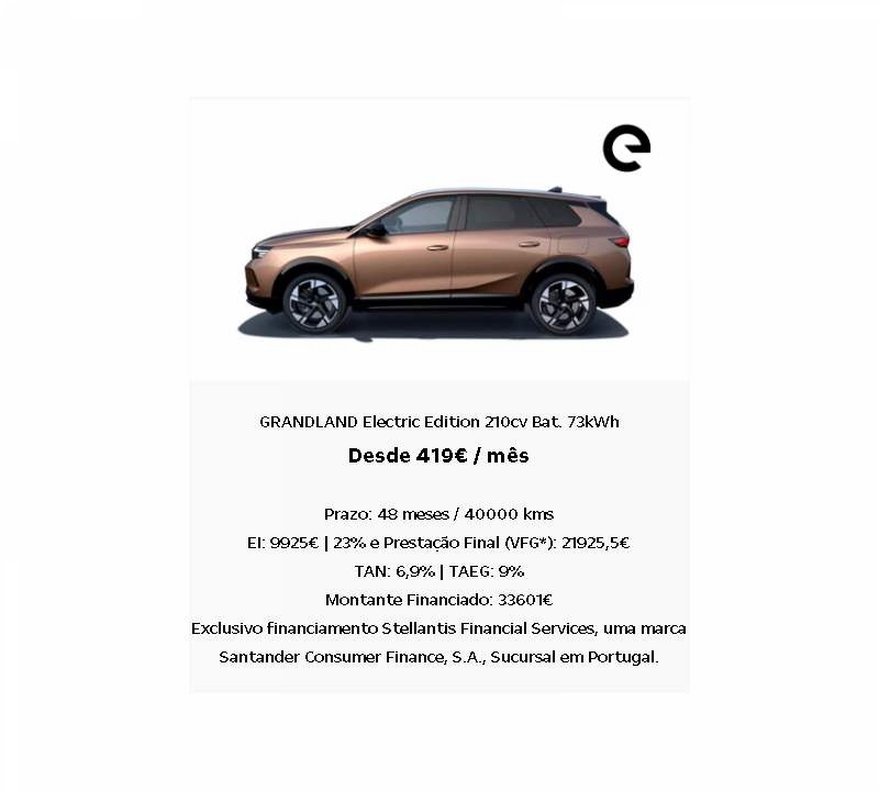 Condições legais: Contrato de crédito automóvel, veículos novos para 48 meses / 40.000 km, exemplo para Grandland Electric Edition 210cv| Bat. 73kWh , PVPR de 46.526,00€, PVP campanha de 43.526,00€, inclui DLTP, sem opções, entrada inicial de 9.925€, montante financiado de 33.601,00€, 47 prestações de 419€, prestação final de 21.925,53€, taxa fixa, TAN de 6,900% e TAEG de 9,0% para um MTIC de 43.027,75€ (inclui comissão de abertura de contrato de 700€, de reconhecimento e envio da declaração de extinção de reserva de 75€ e 32,50€ de custo de extinção de reserva).Condições válidas até 31/01/2026, para clientes particulares. Inclui campanha de apoio à Retoma e Desconto exclusivo ao Financiamento Stellantis Financial Services, uma marca Santander Consumer Finance, S.A., Sucursal em Portugal (registado junto do BdP com o nº 0073), nos concessionários Opel aderentes. A Stellantis Portugal, S.A. registada no Banco de Portugal sob o nº 6803 como intermediário de crédito a título acessório, atua sem caracter de exclusividade do Santander Consumer Finance S.A., Sucursal em Portugal. Informe-se no Santander Consumer Finance S.A., suc.em Portugal. Emissões CO2 ciclo Combinado WLTP (0 g/km); Consumo ciclo combinado WLTP ( 17,1-17,8 kWh/100km); Autonomia Elétrica ciclo Combinado WLTP (564-585 Km).