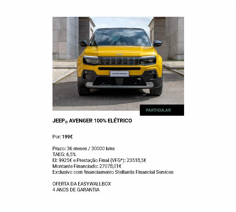 *Menções Legais: Oferta da EasyWallbox. Contrato de crédito automóvel novos para 36 meses / 30.000 km, exemplo para AVENGER Summit Plus 100% Elétrico 115KW - Equipado, PVPR de 47.003,01€, PVP campanha de 37.003,01€, inclui DLTP , entrada inicial de 9.925€, montante financiado de 27.078,01€, 35 prestações de 199€, prestação final de 23.518,54€, taxa fixa, TAN de 4,320% e TAEG de 6,5% para um MTIC de 31.771,11€ (Inclui comissão de abertura de contrato de 700€, de reconhecimento e envio da declaração de extinção de reserva de 75€ e 32,50€ de custo de extinção de reserva). Condições válidas até 31/03/2026, para clientes particulares. Financiado por Stellantis Financial Services, uma marca Santander Consumer Finance, S.A, Sucursal em Portugal (registado junto do BdP com o nº 0073). A FCA Portugal, S.A. registada no Banco de Portugal sob o nº 7205 como intermediário de crédito a título acessório, actua sem caracter de exclusividade. *Valor Final Garantido, condicionado ao cumprimento de condições.Jeep® Avenger elétrico: Consumo elétrico 16 - 15,4 kWh/100km; Emissão de CO2: 0 g/km. Autonomia: 400 - 385 km. Valores de homologação determinados com base no ciclo combinado WLTP. Os valores indicados são para efeitos comparativos. Os valores reais de consumo, CO2 e autonomia dependem de muitos fatores associados, como, a título exemplificativo, mas não limitativo, o estilo de condução, o percurso, as condições meteorológicas, de estrada, para além do tipo de utilização e equipamento do veículo.