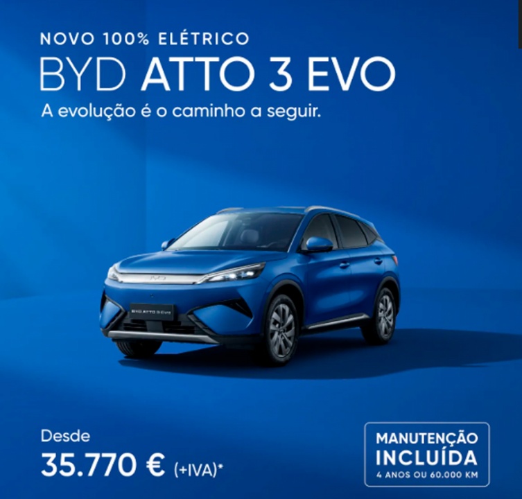*PVP referente ao modelo BYD ATTO 3 EVO versão Design, em vigor até 30/04/2026 nos concessionários BYD aderentes e limitado ao stock existente. Valor não inclui despesas de legalização e transporte nem custos adicionais de pintura. Acresce IVA à taxa legal em vigor. Imagem não contratual. A oferta não inclui montagem e instalação de Wallbox. WLTP: Consumo de energia em kWh/100 km (combinado): 16,4; Autonomia Elétrica em km (combinado-urbano): 510-710. Emissões de CO2 em g/km: 0.