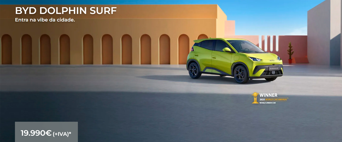 *Preço chave na mão referente ao modelo BYD DOLPHIN SURF versão Boost na cor Lime Green, em vigor até 30/04/2026 nos concessionários BYD aderentes e limitado ao stock existente. Valor inclui despesas de legalização e transporte. Imagem não contratual. WLTP: Consumo de energia em ciclo combinado (kWh/100 km): 15,5 - 16,0; Autonomia elétrica em ciclo combinado (km): 220 - 322; Autonomia elétrica em ciclo urbano (km): 356 - 507; Emissões de CO2 em ciclo combinado (g/km): 0.