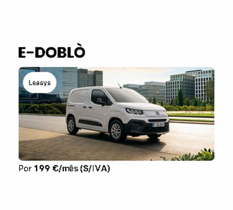 Termos legais: Campanha de Renting para Fiat eDoblò 136cv 50kWh Curta - Série 3, prazo 60 meses e 50.000 km totais, para Empresas e ENI, válida até 30/04/2026 e limitada ao stock existente. Inclui os seguintes serviços: Manutenção, Viatura de Substituição, Assistência em Viagem, Linha de Apoio ao Condutor e Impostos.Entrada Inicial 1.811,58€ sIVA. Acresce IVA à taxa legal em vigor. Imagens meramente ilustrativas. Valores sujeitos a alteração de impostos ou taxas. Para as ilhas o custo de transporte decorre por conta do Cliente e o IVA será ajustado à taxa em vigor. A presente proposta não confere relação contratual e depende de prévia análise de crédito e validação por parte da Leasys.