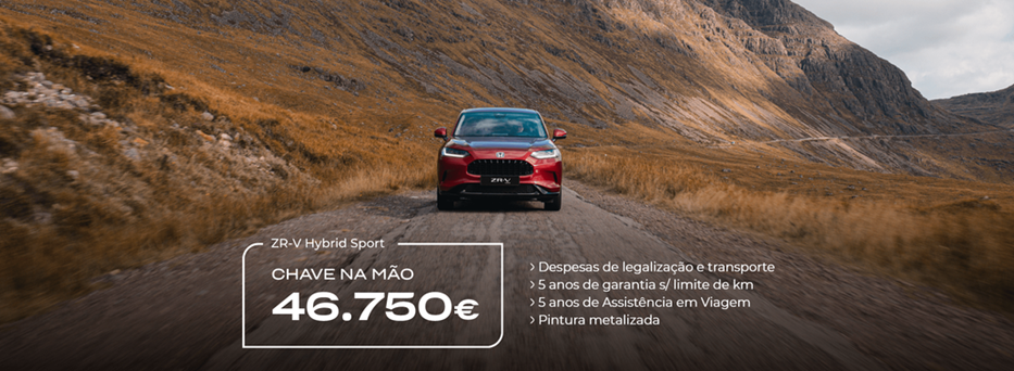 Informação legal: Preço chave na mão referente ao modelo Honda ZR-V e:HEV Sport, incluindo despesas de legalização, transporte, pintura metalizada e ecovalor. Limitado ao stock existente nos concessionários aderentes no continente. Para as ilhas, acresce o custo de transporte marítimo. Imagem não contratual. Condições válidas para unidades em stock abrangidas pela campanha até 31 de março de 2026. Consumos em ciclo combinado (l/100 km): 5.8 L. Emissões CO2 (g/Km): 131.