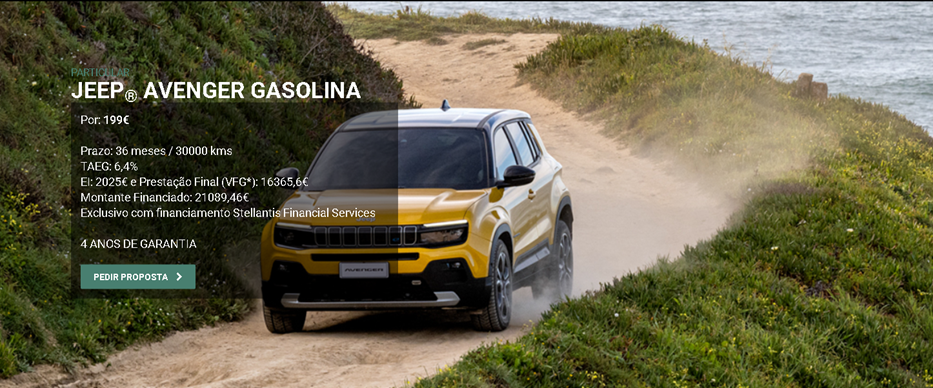 Contrato de crédito automóvel novos para 36 meses / 30.000 km, exemplo para AVENGER ALTITUDE 1.2 GSE T3 100cv MT, PVPR de 31.114,46€, PVP campanha de 23.114,46€, inclui DLTP , entrada inicial de 2.025€, montante financiado de 21.089,46€, 35 prestações de 199€, prestação final de 16.365,63€, taxa fixa, TAN de 3,816% e TAEG de 6,4% para um MTIC de 24.499,86€ (Inclui comissão de abertura de contrato de 700€, de reconhecimento e envio da declaração de extinção de reserva de 75€ e 32,50€ de custo de extinção de reserva). Condições válidas até 31/03/2026, para clientes particulares. Financiado por Stellantis Financial Services, uma marca Santander Consumer Finance, S.A, Sucursal em Portugal (registado junto do BdP com o nº 0073). A FCA Portugal, S.A. registada no Banco de Portugal sob o nº 7205 como intermediário de crédito a título acessório, actua sem caracter de exclusividade. *Valor Final Garantido, condicionado ao cumprimento de condições. Limitado ao stock existente. Jeep® Avenger gasolina: Consumo de combustível: 5,8 - 5,6 l/100 km; Emissões de CO2: 131 - 127 g/km. Valores de homologação determinados com base no ciclo combinado WLTP. Os valores indicados são para efeitos comparativos. Os valores reais de consumo e CO2 dependem de muitos fatores associados, como, a título exemplificativo, mas não limitativo, o estilo de condução, o percurso, as condições meteorológicas, de estrada, para além do tipo de utilização e equipamento do veículo.