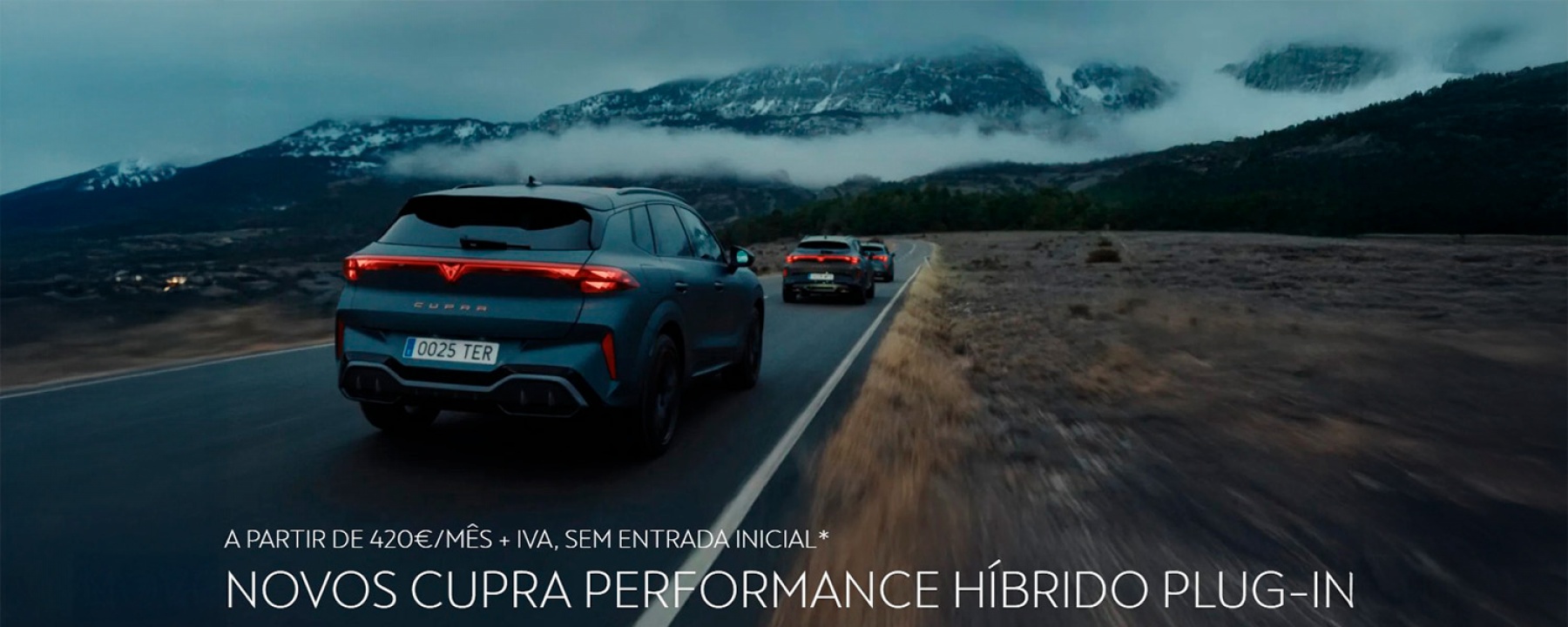 *** Campanha válida para Empresas e ENI - negócios fechados - até 30/03/2026 e limitada ao stock existente. Valor para CUPRA Formentor 1.5 e-Hybrid DSG 204cv. Consumo combustível combinado WLTP (l/100km):1,4 – 1,6. Consumo elétrico combinado WLTP (kWh/100km): 13,2 – 13,9. Emissões CO2 WLTP (g/km): 32 - 36. Imagem não contratual.