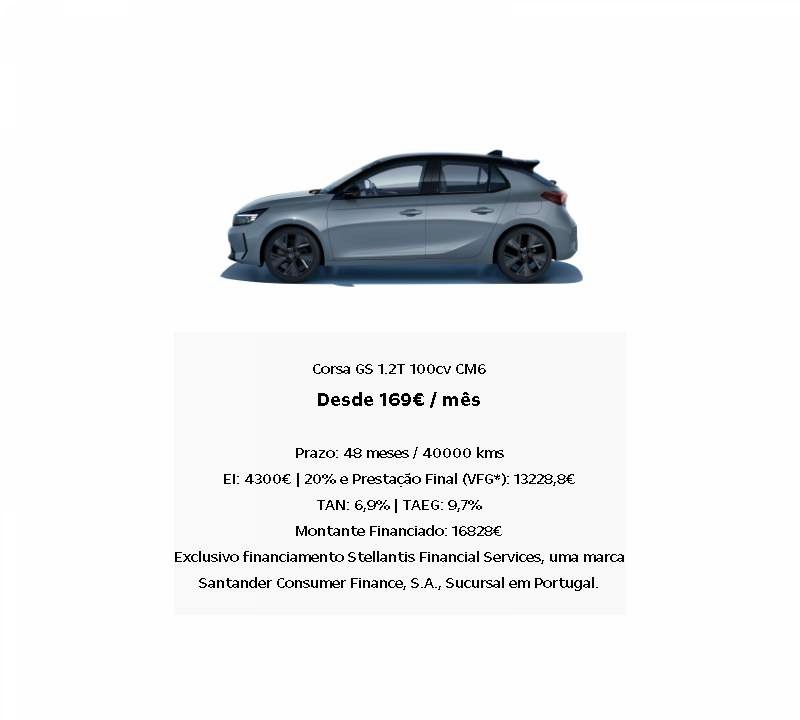 Condições legais: Contrato de crédito automóvel, veículos novos para 48 meses / 40.000 km, exemplo para Corsa GS 1.2T 100cv CM6, PVPR de 24.128,00€, PVP campanha de 21.128,00€, inclui DLTP, sem opções, entrada inicial de 4.300€, montante financiado de 16.828,00€, 47 prestações de 169€, prestação final de 13.228,83€, taxa fixa, TAN de 6,900% e TAEG de 9,7% para um MTIC de 22.258,11€ (inclui comissão de abertura de contrato de 700€, de reconhecimento e envio da declaração de extinção de reserva de 75€ e 32,50€ de custo de extinção de reserva).Condições válidas até 31/01/2026, para clientes particulares. Inclui campanha de apoio à Retoma e Desconto exclusivo ao Financiamento Stellantis Financial Services, uma marca Santander Consumer Finance, S.A., Sucursal em Portugal (registado junto do BdP com o nº 0073), nos concessionários Opel aderentes. A Stellantis Portugal, S.A. registada no Banco de Portugal sob o nº 6803 como intermediário de crédito a título acessório, atua sem caracter de exclusividade do Santander Consumer Finance S.A., Sucursal em Portugal. Informe-se no Santander Consumer Finance S.A., suc.em Portugal. Emissões WLTP (114-132 g/km); Consumo combinado WLTP (5,1-5,9 l/kms).