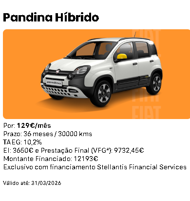Condições legais: Contrato de crédito automóvel novos para 36 meses / 30.000 km, exemplo para PANDINA 1.0 Hybrid 65cv ICON, PVPR de 19.343,00€, PVP campanha de 15.843,00€, inclui DLTP, entrada inicial de 3.650€, montante financiado de 12.193,00€, 35 prestações de 129€, prestação final de 9.732,45€, taxa fixa, TAN de 6,024% e TAEG de 10,2% para um MTIC de 15.277,60€. (Inclui comissão de abertura de contrato de 700€, de reconhecimento e envio da declaração de extinção de reserva de 75€ e 32,50€ de custo de extinção de reserva). Condições válidas até 31/03/2026, para clientes particulares. Financiado por Stellantis Financial Services, uma marca Santander Consumer Finance, S.A, Sucursal em Portugal (registado junto do BdP com o nº 0073). A FCA Portugal, S.A. registada no Banco de Portugal sob o nº 7205 como intermediário de crédito a título acessório, actua sem caracter de exclusividade. Informe-se no Santander Consumer Finance S.A. *Valor Final Garantido, condicionado ao cumprimento de condições. Limitado ao stock existente.Ciclo combinado WLTP: Consumos de combustível de 4,8 a 4,9 l/100km e emissões de CO2 de 108 a 110 g/km. Os valores reais de consumo e CO2 dependem de muitos fatores associados, como, a título exemplificativo, estilo de condução, percurso e equipamento do veículo.