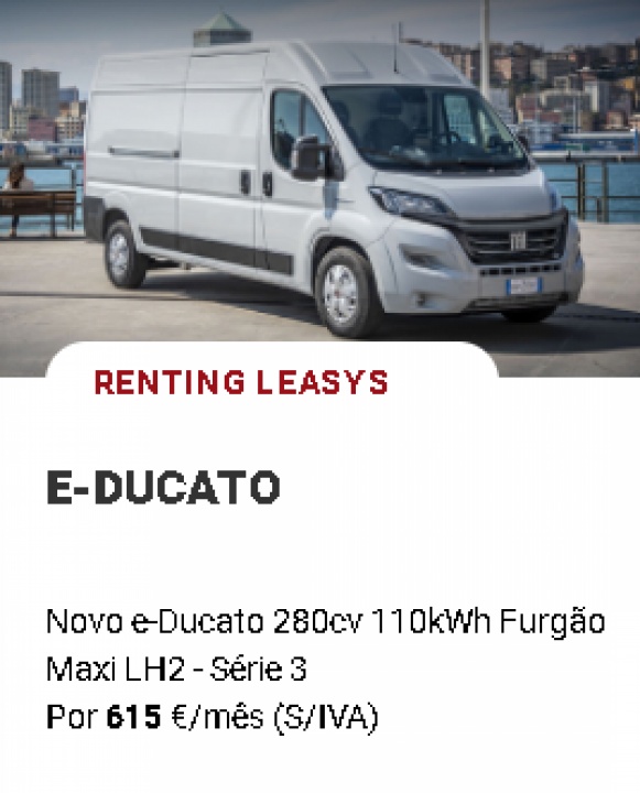 Informação legal: Campanha de Renting para Novo e-Ducato 280cv 110kWh Furgão Maxi LH2 - Série 3, prazo 48 meses e 80.000 km totais, para Empresas e ENI, válida até 31/01/2026 e limitada ao stock existente. Inclui os seguintes serviços: Manutenção, Viatura de Substituição, Assistência em Viagem, Linha de Apoio ao Condutor e Impostos. Acresce IVA à taxa legal em vigor. Imagens meramente ilustrativas. Valores sujeitos a alteração de impostos ou taxas. Para as ilhas o custo de transporte decorre por conta do Cliente e o IVA será ajustado à taxa em vigor. A presente proposta não confere relação contratual e depende de prévia análise de crédito e validação por parte da Leasys.