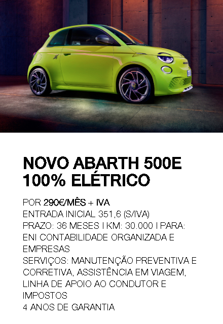 Condições legais: Campanha de Renting para Fiat Abarth 500e 100% Elétrico , prazo 36 meses e 30.000 km totais, para Empresas e ENI, válida até 31/03/2026 e limitada ao stock existente. Entrada inicial 351,6 (s/IVA). Inclui os seguintes serviços: Manutenção preventiva e corretiva, Assistência em Viagem, Linha de Apoio ao Condutor e Impostos.Acresce IVA à taxa legal em vigor. Acresce IVA à taxa legal em vigor. Imagens meramente ilustrativas. Valores sujeitos a alteração de impostos ou taxas. Para as ilhas o custo de transporte decorre por conta do Cliente e o IVA será ajustado à taxa em vigor. A presente proposta não confere relação contratual e depende de prévia análise de crédito e validação por parte da Leasys.Ciclo combinado WLTP: Consumo de energia elétrica: 17,9 kWh/100 kWh; Emissões de CO2: 0 g/km; Autonomia: 255 km. Valores de homologação determinados com base no ciclo combinado WLTP. Os valores indicados são para efeitos comparativos. Os valores reais de consumo e CO2 dependem de muitos fatores associados, como, a título exemplificativo, estilo de condução, percurso e equipamento do veículo.