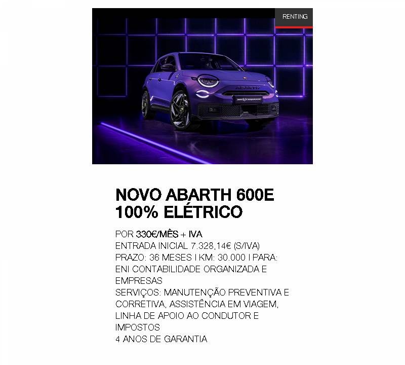 Condições legais:Campanha de Renting para Fiat Abarth 600e 100% Elétrico , prazo 36 meses e 30.000 km totais, para Empresas e ENI, válida até 31/03/2026 e limitada ao stock existente. Entrada inicial 7.328,14€ (s/IVA). Inclui os seguintes serviços: Manutenção preventiva e corretiva, Assistência em Viagem, Linha de Apoio ao Condutor e Impostos.Acresce IVA à taxa legal em vigor. Acresce IVA à taxa legal em vigor. Imagens meramente ilustrativas. Valores sujeitos a alteração de impostos ou taxas. Para as ilhas o custo de transporte decorre por conta do Cliente e o IVA será ajustado à taxa em vigor. A presente proposta não confere relação contratual e depende de prévia análise de crédito e validação por parte da Leasys. Ciclo combinado WLTP: Consumo de energia elétrica: 17,9-19,0 kWh/100 kWhm; Emissões de CO2: 0 g/km; Autonomia: 317-334 km. Valores de homologação determinados com base no ciclo combinado WLTP. Os valores indicados são para efeitos comparativos. Os valores reais de consumo e CO2 dependem de muitos fatores associados, como, a título exemplificativo, estilo de condução, percurso e equipamento do veículo.