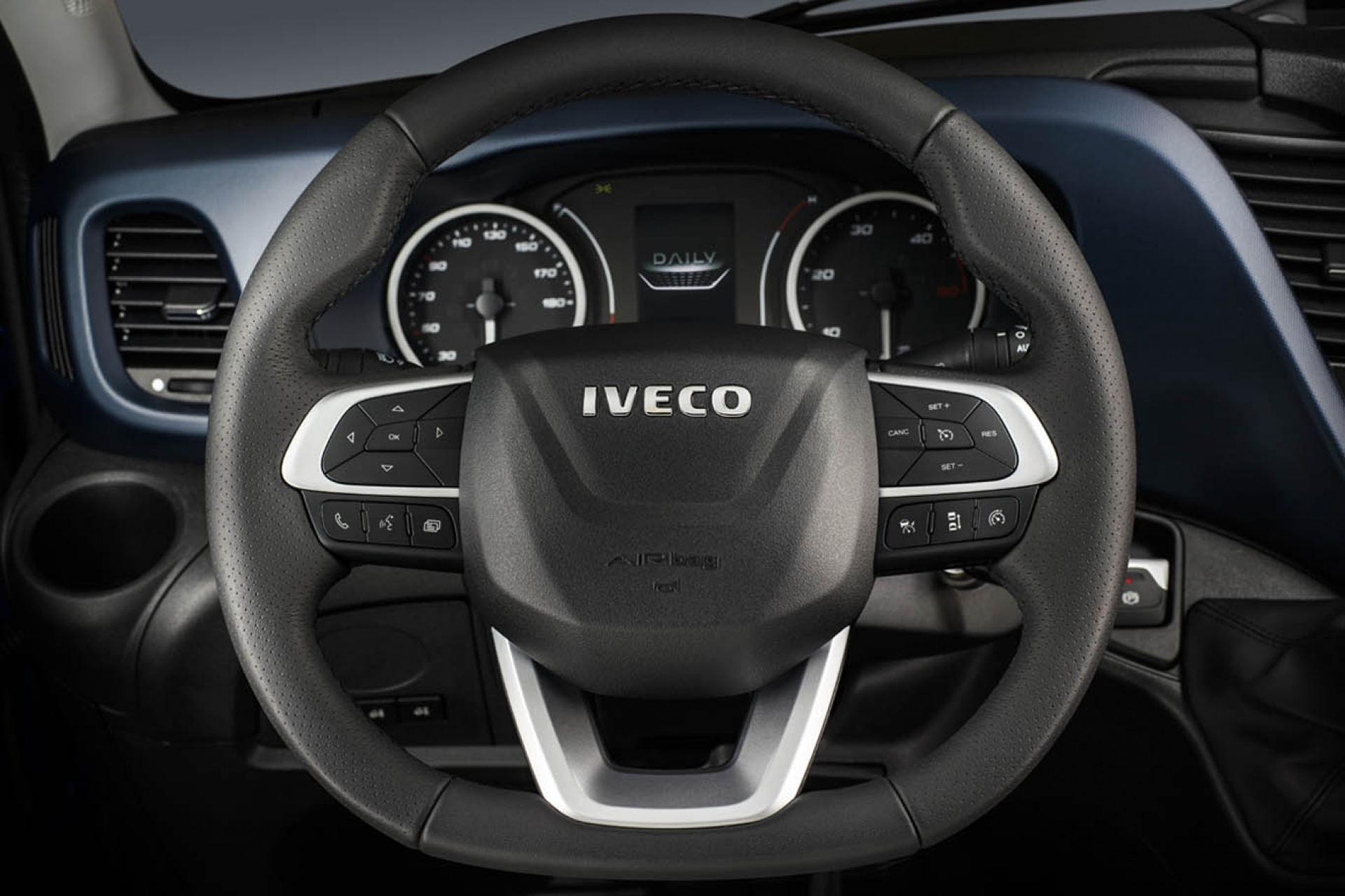 • Conforto de condução superior e ergonomia - Todo o sistema de direção da Daily foi redesenhado para lhe dar uma experiência de bordo de um automóvel ligeiro de passageiros. Pode fazer ajustes axiais e angulares na direção roda e configurar a posição de condução perfeita para melhor conforto e ergonomia. Desfrute da luxuosa sensação de aderência ao volante em pele nos seus longos dias de trabalho, estando todos os comandos na ponta dos seus dedos. Sem distrações e esforço. No congestionamento da hora de ponta, pode ativar o Assistente de Fila com o toque de um botão. O stress da hora de ponta será uma coisa do passado!