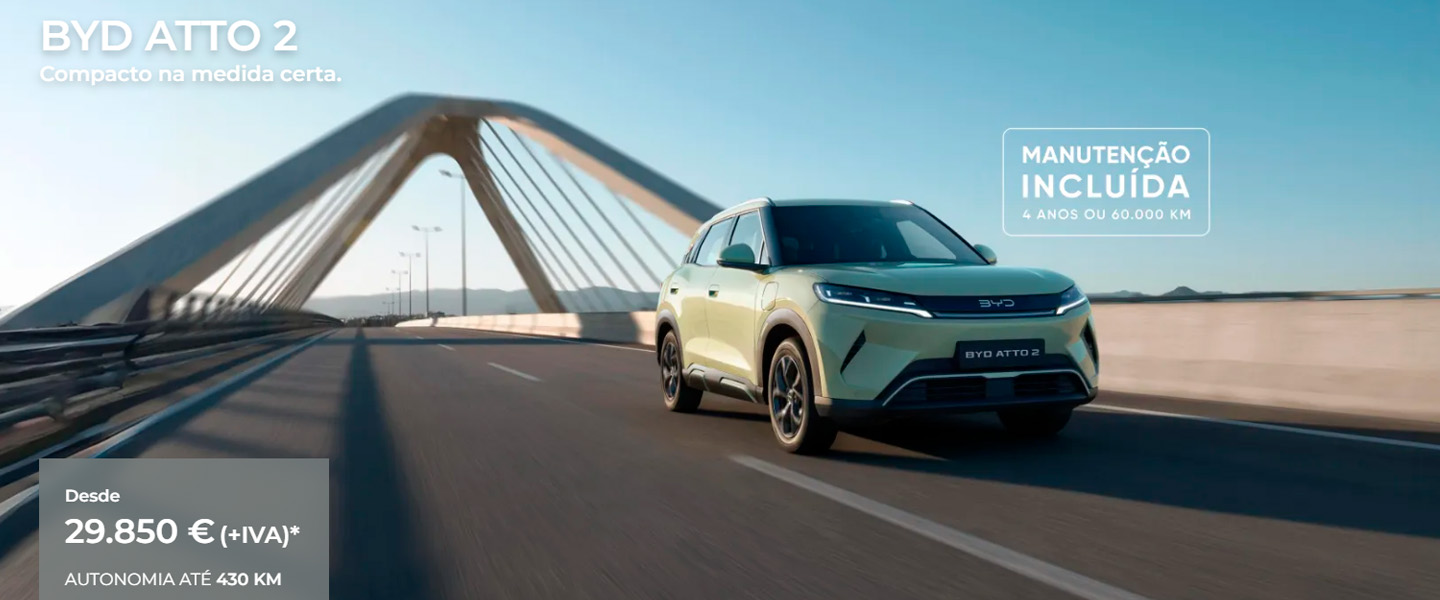 *PVP referente ao modelo BYD ATTO 2 versão Comfort, em vigor até 30/04/2026 nos concessionários BYD aderentes e limitado ao stock existente. Valor não inclui despesas de legalização e transporte nem custos adicionais de pintura. Acresce IVA à taxa legal em vigor. Imagem não contratual. WLTP: Consumo de energia em kWh/100 km (combinado): 17,4; Autonomia Elétrica em km (combinado-urbano): 430-604. Emissões de CO2 em g/km: 0.