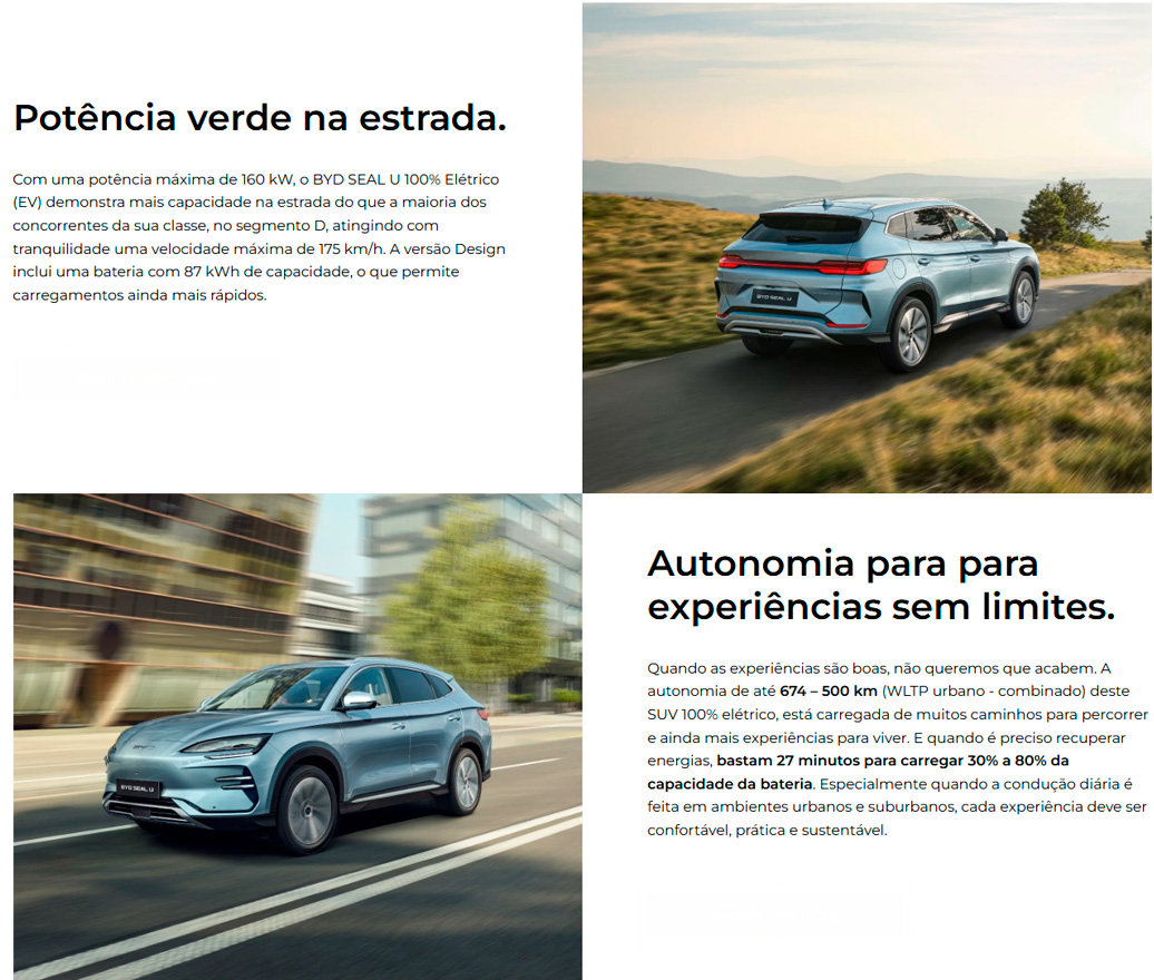 *PVP referente ao modelo BYD SEAL U versão Comfort, em vigor até 30/04/2026 nos concessionários BYD aderentes e limitado ao stock existente. Valor não inclui despesas de legalização e transporte nem custos adicionais de opção de pintura. Acresce IVA à taxa legal em vigor. Imagem não contratual. WLTP: Consumo de energia em kWh/100 km (combinado): 19,9; Autonomia Elétrica em km (combinado-urbano): 420-576. Emissões de CO2 em g/km: 0.