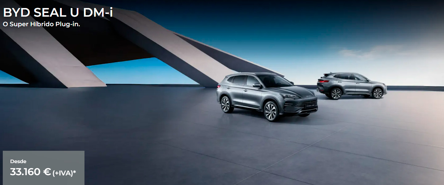 *PVP referente ao modelo BYD SEAL U DM-i versão Boost, em vigor até 31/10/2025 nos concessionários BYD aderentes e limitado ao stock existente. Valor não inclui despesas de legalização, transporte e custos adicionais de opção de pintura. Acresce IVA à taxa legal em vigor. Imagem não contratual. WLTP: Consumo de energia em ciclo combinado (kWh/100 km): 17,9 - 23,5; Consumo de combustível em ciclo combinado (l/100 km): 5,6 - 7,4; Consumo ponderado em ciclo combinado (l/100 km): 0,4 - 1,2; Autonomia elétrica em ciclo combinado (km): 70 - 125; Autonomia total (elétrico + combustível): 870 - 1125 km; Emissões de CO2 em ciclo combinado (g/km): 9 – 26.
