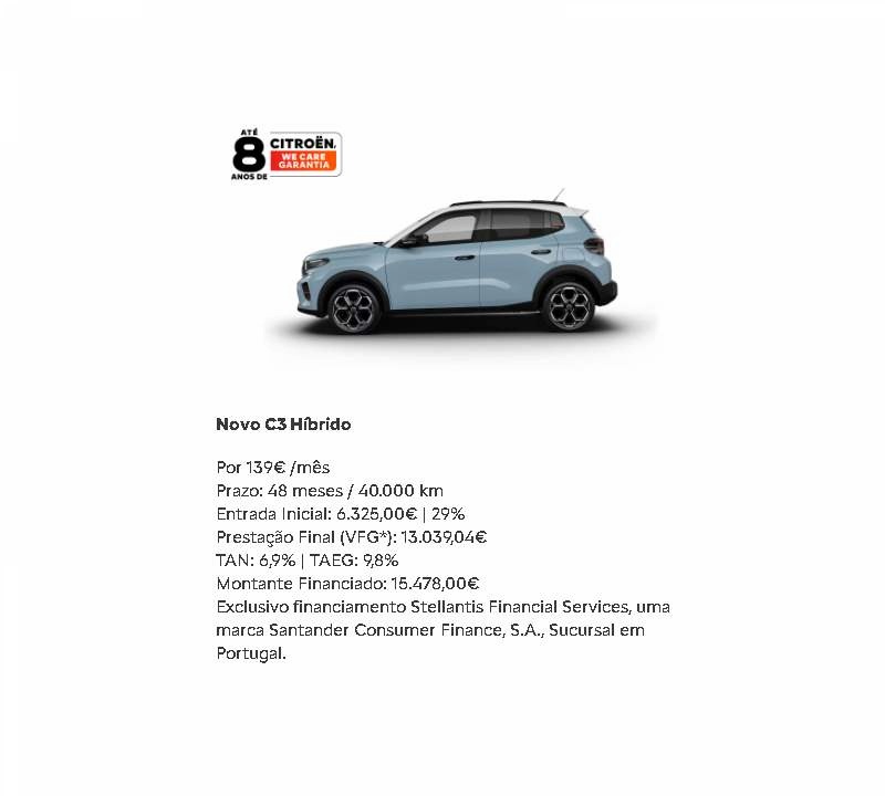 Contrato de crédito automóvel, veículos novos para 48 meses / 40.000 km, exemplo para C3 Híbrido 110cv Automático - PLUS, PVPR de 23.303,00€, PVP campanha de 21.803,00€, inclui DLTP, , entrada inicial de 6.325€, montante financiado de 15.478,00€, 47 prestações de 139€, prestação final de 13.039,04€, taxa fixa, TAN de 6,900% e TAEG de 9,8% para um MTIC de 20.656,19€ (inclui comissão de abertura de contrato de 700€, de reconhecimento e envio da declaração de extinção de reserva de 75€ e 32,50€ de custo de extinção de reserva).Condições válidas até 31/12/2025, para clientes particulares. Inclui campanha de apoio à Retoma e Desconto exclusivo ao Financiamento Stellantis Financial Services, uma marca Santander Consumer Finance, S.A., Sucursal em Portugal (registado junto do BdP com o nº 0073), nos concessionários Citroen aderentes. A Stellantis Portugal, S.A. registada no Banco de Portugal sob o nº 6803 como intermediário de crédito a título acessório, atua sem caracter de exclusividade do Santander Consumer Finance S.A., Sucursal em Portugal. Informe-se no Santander Consumer Finance S.A., suc.em Portugal."