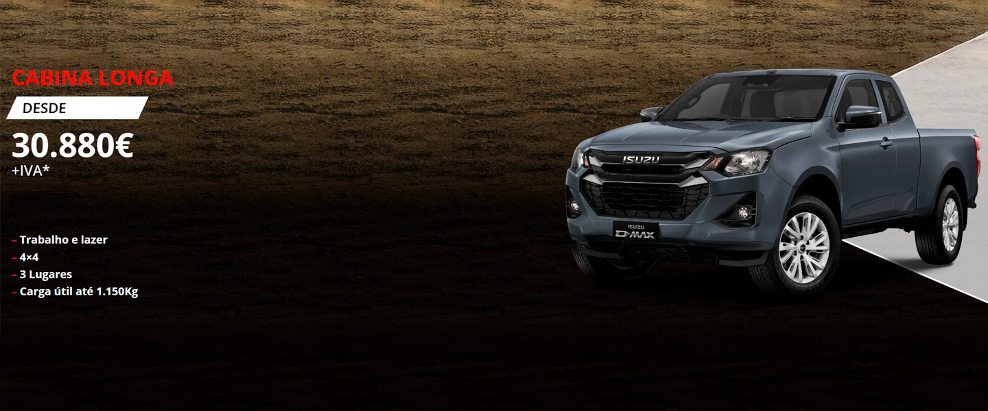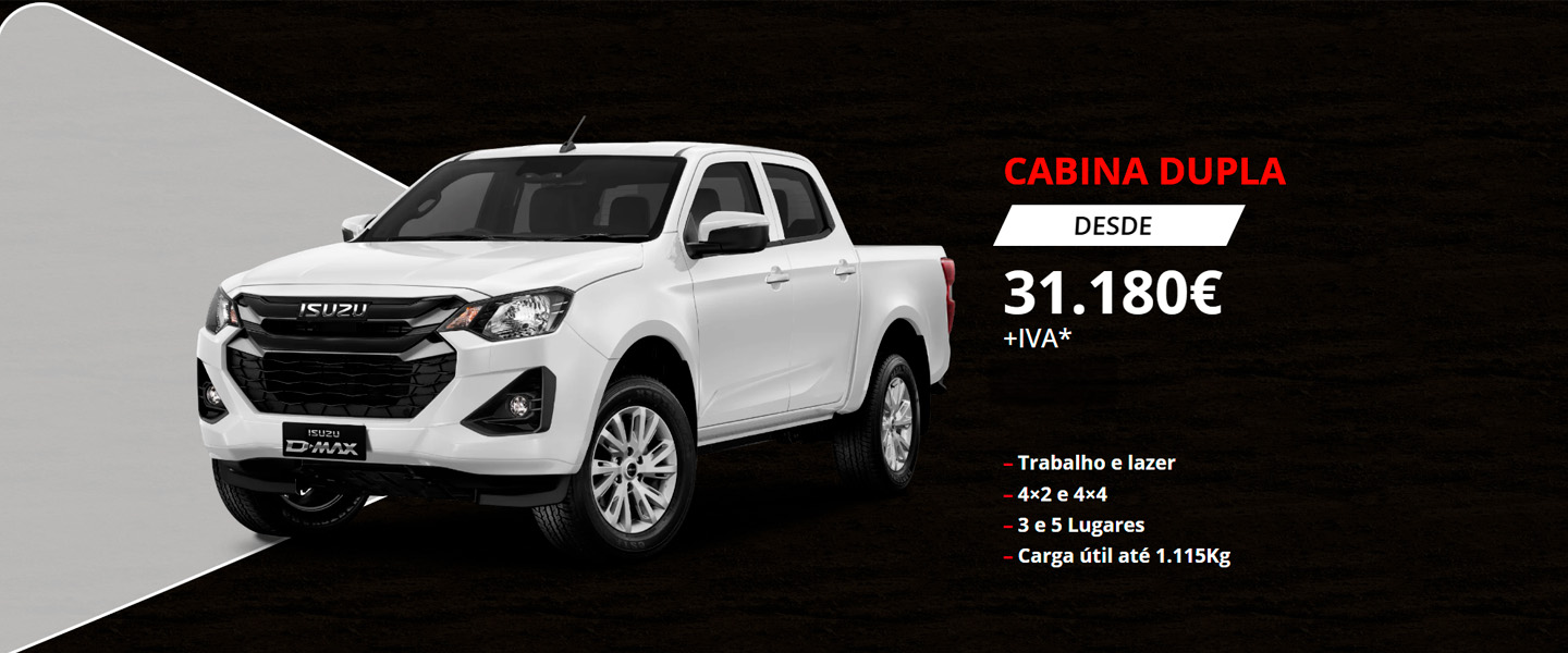 *Exemplo para Isuzu D-Max 1.9 Litros Cabina Longa 4×4 ATX em gama de trabalho. Acrescem despesas de preparação e legalização e eco taxas. IVA não incluído. Condições válidas até 31/03/2026 e limitada ao stock existente em Portugal Continental (para as Ilhas acrescem custos de transporte). Campanha válida nos concessionários Isuzu aderentes. Ilustrações não contratuais. Para mais informações contate um concessionário Isuzu.