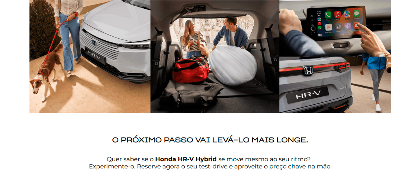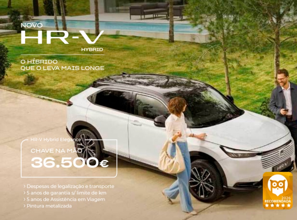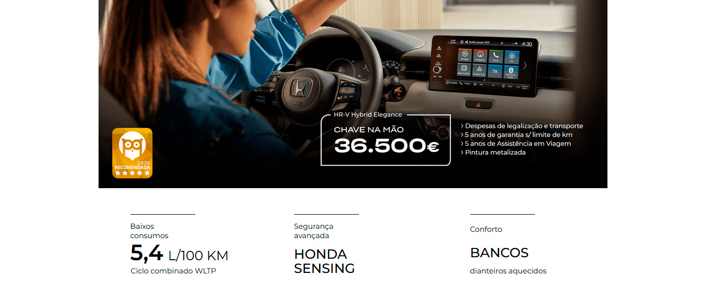 Preço chave na mão referente ao modelo Honda HR-V e:HEV Elegance, incluindo despesas de legalização, transporte, pintura metalizada e ecovalor. Limitado ao stock existente nos concessionários aderentes no continente. Para as ilhas, acresce o custo de transporte marítimo. Imagem não contratual. Condições válidas para unidades em stock abrangidas pela campanha até 26 de fevereiro de 2026. Consumos em ciclo combinado (l/100 Km): 5.4L. Emissões CO2 (g/Km): 122.