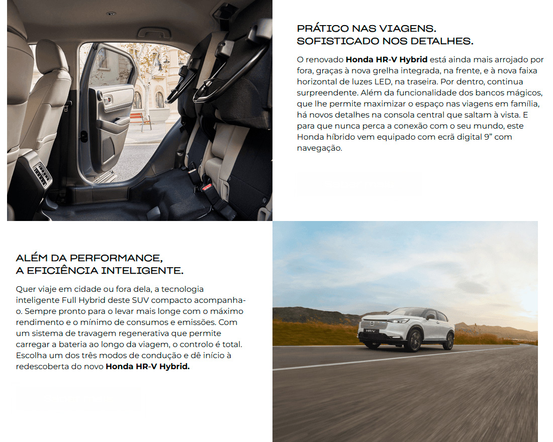 Repensado para simplificar as suas deslocações diárias, o novo Honda HR-V Hybrid destaca-se pelo design arrojado, espaço para novas funcionalidades e conforto superior. Tudo com a segurança e a eficiência híbrida excecional de sempre. Vá mais longe ao volante do seu novo SUV compacto híbrido, agora por apenas 36.500€, preço final com tudo incluído.
