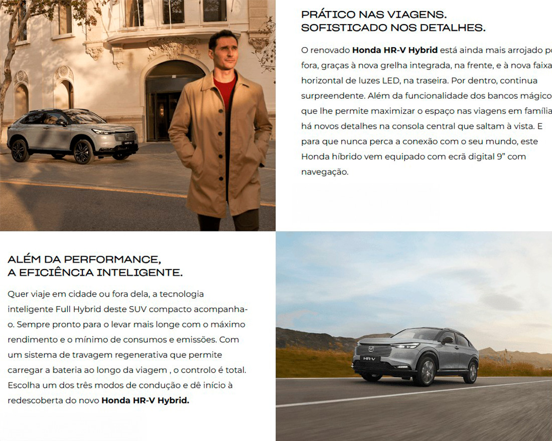 *Exemplo para um contrato de crédito automóvel com reserva de propriedade de um HR-V 1.5 i-MMD e:HEV Elegance a 60 meses. PVP de 36.250,00€, entrada inicial de 14.246,25€, montante financiado de 22.003,75€, reembolsado em 59 prestações mensais constantes de 260€ e última prestação mensal de 14.303,16€. Comissão de abertura de crédito no valor de 500€. Taxa Fixa. TAN 8,000%. TAEG 9,9%. Montante Total Imputado ao Consumidor (MTIC) de 30.530,43€. Campanha válida até 31/7/2025. A TAEG incluí o Imposto de Selo no valor de 387,27€. Proposta sujeita a aprovação. A alteração do montante financiado refletir-se-á nos cálculos financeiros. Para mais informações, consulte o BBVA Instituição Financeira de Crédito S.A. registada no Banco de Portugal com o n.º 0800. Proposta sujeita a análise de solvabilidade e aprovação. A Sózó Portugal, S.A. está registada junto do Banco de Portugal sob o nº 0006846 e atua como Intermediário de Crédito a título acessório em regime de não exclusividade.