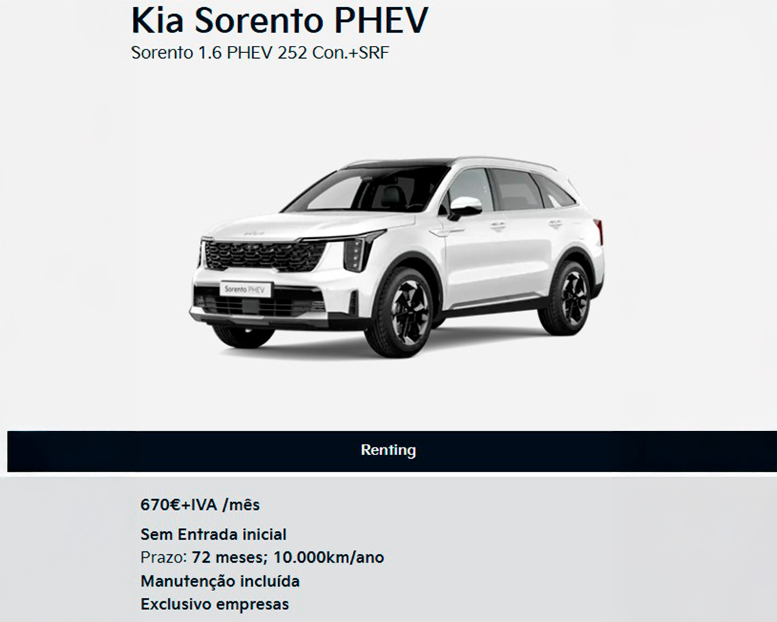 Kia Sorento 1.6 T-GDi 6AT PHEV 7L Concept + SRF 4WD em Aluguer Operacional de Viaturas, prazo 72 Meses / 60.000km. Sem entrada inicial. Inclui os serviços: Aluguer, IUC, IPO, Manutenção Plus, Assistência em viagem. Seguro não incluído, mas obrigatório, de danos próprios e Responsabilidade Civil (capital máximo €50.000.000) com direitos ressalvados à Locadora. Inclui despesas de preparação e legalização. Condições válidas até 31/12/2025 para clientes empresa, e limitada ao stock existente em Portugal Continental (para as Ilhas acrescem custos de transporte) nos Concessionários Kia aderentes. Contrato KIA RENTING, condicionado à aprovação do Comité de Crédito da Arval Service Lease, SA. Imagens meramente ilustrativas. Consumo Combinado WLTP (l/100km): 1,6 e kWh/100km: 18,2. Emissões CO2 WLTP (g/km): 37 e 0.