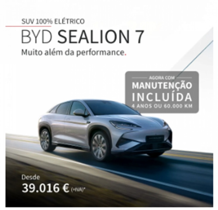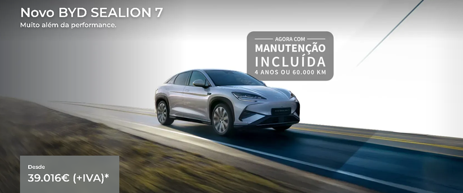 *PVP referente ao modelo BYD SEALION 7 versão Comfort, em vigor até 28/02/2026 nos concessionários BYD aderentes e limitado ao stock existente. Valor não inclui despesas de legalização e transporte nem custos adicionais de opção de pintura. Acresce IVA à taxa legal em vigor. Imagem não contratual. WLTP: Consumo de energia em kWh/100 km (combinado): 19,9; Autonomia Elétrica em km (combinado-urbano): 482-631. Emissões de CO2 em g/km: 0.