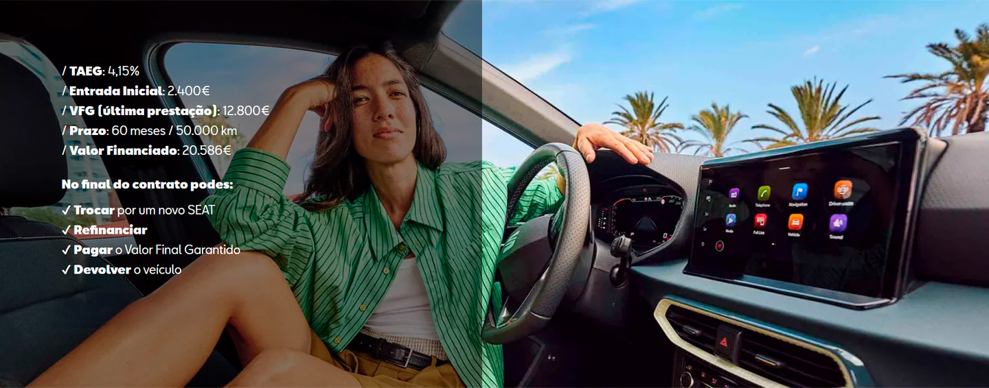 * Exemplo para SEAT Arona 1.0 TSI Style 95cv. Prestação Mensal de 215,42€ com manutenção preventiva incluída no valor da prestação de 16,90€/mês. Contrato para 60 meses e 50.000 km. PVPR 23.256,06€. Entrada Inicial de 2.400,00€. Valor Financiado de 20.856,06€ e Valor Final Garantido 12.800,37€. MTIC de 25.630,12€. TAN 4,15% e TAEG 5,98%. Acresce 750,00€ de comissão de abertura em Crédito Automóvel para viaturas novas com reserva de propriedade. Campanha válida até 30/04/2026. Valor Final Garantido – última prestação do contrato que pode ser liquidada contra a entrega do veículo, desde que observadas as condições indicadas em vwfs.pt. Financiado por SEAT Financial Services, uma marca Volkswagen Bank GmbH, Sucursal em Portugal registado(a) no Banco de Portugal sob n.º 264. A SIVA registado(a) no Banco de Portugal sob n.º 6651, atua como intermediário de Crédito a título acessório e sem carácter de exclusividade. Recomenda-se a leitura prévia das condições contratuais. Para mais informações consulte os concessionários oficiais SEAT. Imagem não contratual. Consumo (l/100km): 5,3. Emissões CO2 (g/km): 121 (WLTP). A idade é uma atitude.