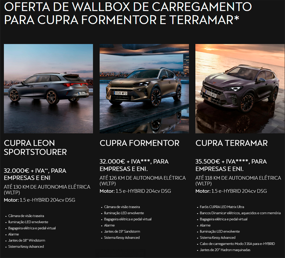 * Oferta de Wallbox de Carregamento MOON Inch Lite, ou desconto de valor equivalente para clientes Particulares, Empresas e ENI, exeto para CUPRA Leon e CUPRA Leon Sportstourer.