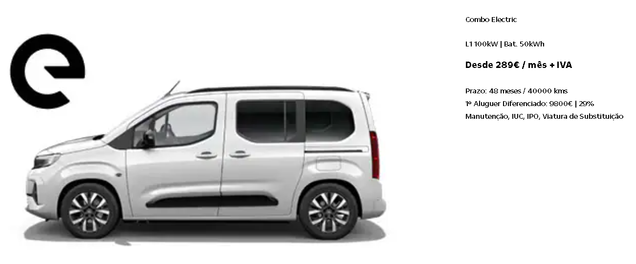 Exemplo para Combo Electric L1 100kW | Bat. 50kWh; inclui despesas de legalização, transporte e preparação, Sem Opções, em Aluguer Operacional de Viaturas a 48 meses e 40000 km. 1º aluguer diferenciado de 9800,00 €. Exclusivo para clientes particulares. Aluguer Mensal inclui IUC, IPO, Manutenção, nos termos do contrato de Renting, condicionado à aprovação da Stellantis Financial Services, uma marca Santander Consumer Finance, S.A., Sucursal em Portugal. Não incluído: Seguro obrigatório.Condições válidas até 31 de Dezembro de 2025, nos concessionários Opel aderentes. Imagem não contratual.