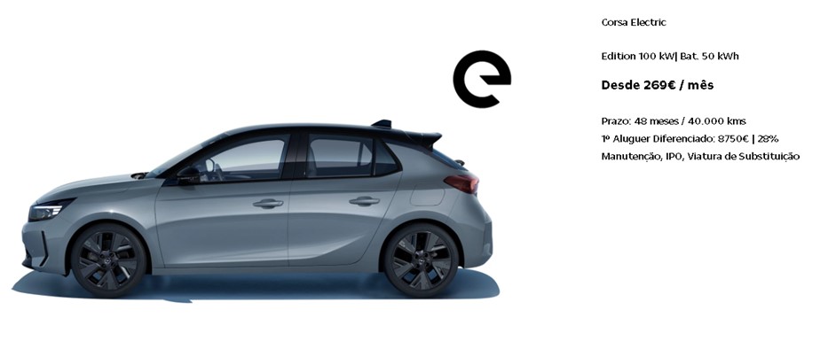 Exemplo para Corsa Electric Edition 100 kW| Bat. 50 kWh ; inclui despesas de legalização, transporte e preparação, Sem Opções, em Aluguer Operacional de Viaturas a 48 meses e 40000 km. 1º aluguer diferenciado de 8750,00 €. Exclusivo para clientes particulares. Aluguer Mensal inclui IUC, IPO, Manutenção, nos termos do contrato de Renting, condicionado à aprovação da Stellantis Financial Services, uma marca Santander Consumer Finance, S.A., Sucursal em Portugal. Não incluído: Seguro obrigatório.Condições válidas até 31 de Dezembro de 2025, nos concessionários Opel aderentes. Imagem não contratual. Emissões WLTP (0 g/km); Consumo combinado WLTP ( 15,0-16,2 kWh/ 100km);Autonomia Elétrica Combinado (AER) (346-373 Kms).