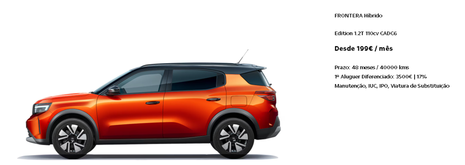 Exemplo para Frontera Hybrid Edition 1.2T 110cv CADC6; inclui despesas de legalização, transporte e preparação, Sem Opções, em Aluguer Operacional de Viaturas a 48 meses e 40000 km. 1º aluguer diferenciado de 3500,00 €. Exclusivo para clientes particulares. Aluguer Mensal inclui IUC, IPO, Manutenção, nos termos do contrato de Renting, condicionado à aprovação da Stellantis Financial Services, uma marca Santander Consumer Finance, S.A., Sucursal em Portugal. Não incluído: Seguro obrigatório.Condições válidas até 31 de Dezembro de 2025, nos concessionários Opel aderentes. Imagem não contratual. Emissões WLTP (122 g/km); Consumo combinado WLTP ( 5,5 l/ 100km).