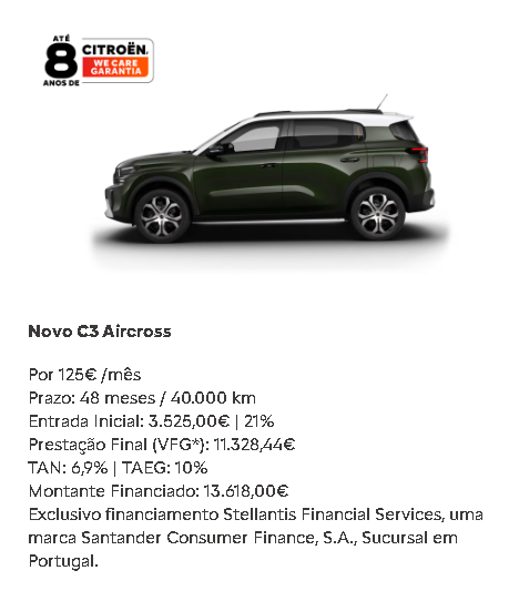 Contrato de crédito automóvel, veículos novos para 48 meses / 40.000 km, exemplo para ë-C3 Elétrico 113cv Autonomia Urbana - YOU, PVPR de 21.343,00€, PVP campanha de 19.343,00€, inclui DLTP, , entrada inicial de 5.200€, montante financiado de 14.143,00€, 47 prestações de 149€, prestação final de 10.726,42€, taxa fixa, TAN de 6,900% e TAEG de 10,1% para um MTIC de 18.782,54€ (inclui comissão de abertura de contrato de 700€, de reconhecimento e envio da declaração de extinção de reserva de 75€ e 32,50€ de custo de extinção de reserva).Condições válidas até 31/12/2025, para clientes particulares. Inclui campanha de apoio à Retoma e Desconto exclusivo ao Financiamento Stellantis Financial Services, uma marca Santander Consumer Finance, S.A., Sucursal em Portugal (registado junto do BdP com o nº 0073), nos concessionários Citroen aderentes. A Stellantis Portugal, S.A. registada no Banco de Portugal sob o nº 6803 como intermediário de crédito a título acessório, atua sem caracter de exclusividade do Santander Consumer Contrato de crédito automóvel, veículos novos para 48 meses / 40.000 km, exemplo para C3 AIRCROSS Turbo 100cv Manual - YOU, PVPR de 20.643,00€, PVP campanha de 17.143,00€, inclui DLTP, , entrada inicial de 3.525€, montante financiado de 13.618,00€, 47 prestações de 125€, prestação final de 11.328,44€, taxa fixa, TAN de 6,900% e TAEG de 10,0% para um MTIC de 18.251,09€ (inclui comissão de abertura de contrato de 700€, de reconhecimento e envio da declaração de extinção de reserva de 75€ e 32,50€ de custo de extinção de reserva).Condições válidas até 31/12/2025, para clientes particulares. Inclui campanha de apoio à Retoma e Desconto exclusivo ao Financiamento Stellantis Financial Services, uma marca Santander Consumer Finance, S.A., Sucursal em Portugal (registado junto do BdP com o nº 0073), nos concessionários Citroen aderentes. A Stellantis Portugal, S.A. registada no Banco de Portugal sob o nº 6803 como intermediário de crédito a título acessório, atua sem caracter de exclusividade do Santander Consumer Finance S.A., Sucursal em Portugal. Informe-se no Santander Consumer Finance S.A., suc.em Portugal."