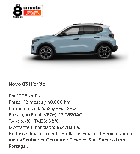 Contrato de crédito automóvel, veículos novos para 48 meses / 40.000 km, exemplo para C3 Híbrido 110cv Automático - PLUS, PVPR de 23.303,00€, PVP campanha de 21.803,00€, inclui DLTP, , entrada inicial de 6.325€, montante financiado de 15.478,00€, 47 prestações de 139€, prestação final de 13.039,04€, taxa fixa, TAN de 6,900% e TAEG de 9,8% para um MTIC de 20.656,19€ (inclui comissão de abertura de contrato de 700€, de reconhecimento e envio da declaração de extinção de reserva de 75€ e 32,50€ de custo de extinção de reserva).Condições válidas até 31/12/2025, para clientes particulares. Inclui campanha de apoio à Retoma e Desconto exclusivo ao Financiamento Stellantis Financial Services, uma marca Santander Consumer Finance, S.A., Sucursal em Portugal (registado junto do BdP com o nº 0073), nos concessionários Citroen aderentes. A Stellantis Portugal, S.A. registada no Banco de Portugal sob o nº 6803 como intermediário de crédito a título acessório, atua sem caracter de exclusividade do Santander Consumer Finance S.A., Sucursal em Portugal. Informe-se no Santander Consumer Finance S.A., suc.em Portugal."Parte superior do formulário.