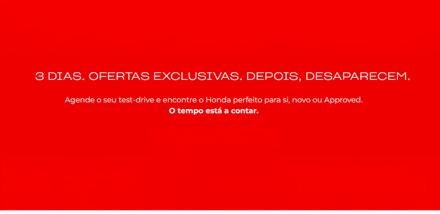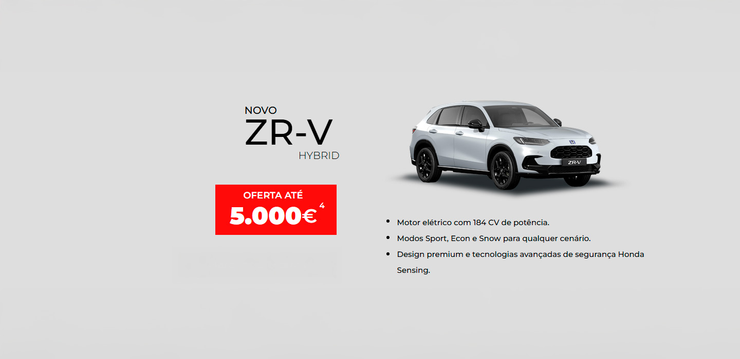 *Campanha válida para matrículas até 21 de novembro de 2025, nos Concessionários Aderentes, exemplo de oportunidade 5.000€ para o modelo ZR-V Sport (4.500€ de desconto direto + 500€ em campanha swapON), limitada às unidades em campanha existente. Válido para clientes particulares registados na plataforma myHONDA. As imagens e equipamentos apresentados são meramente ilustrativos e podem não corresponder às versões em campanha ou comercializadas em Portugal.