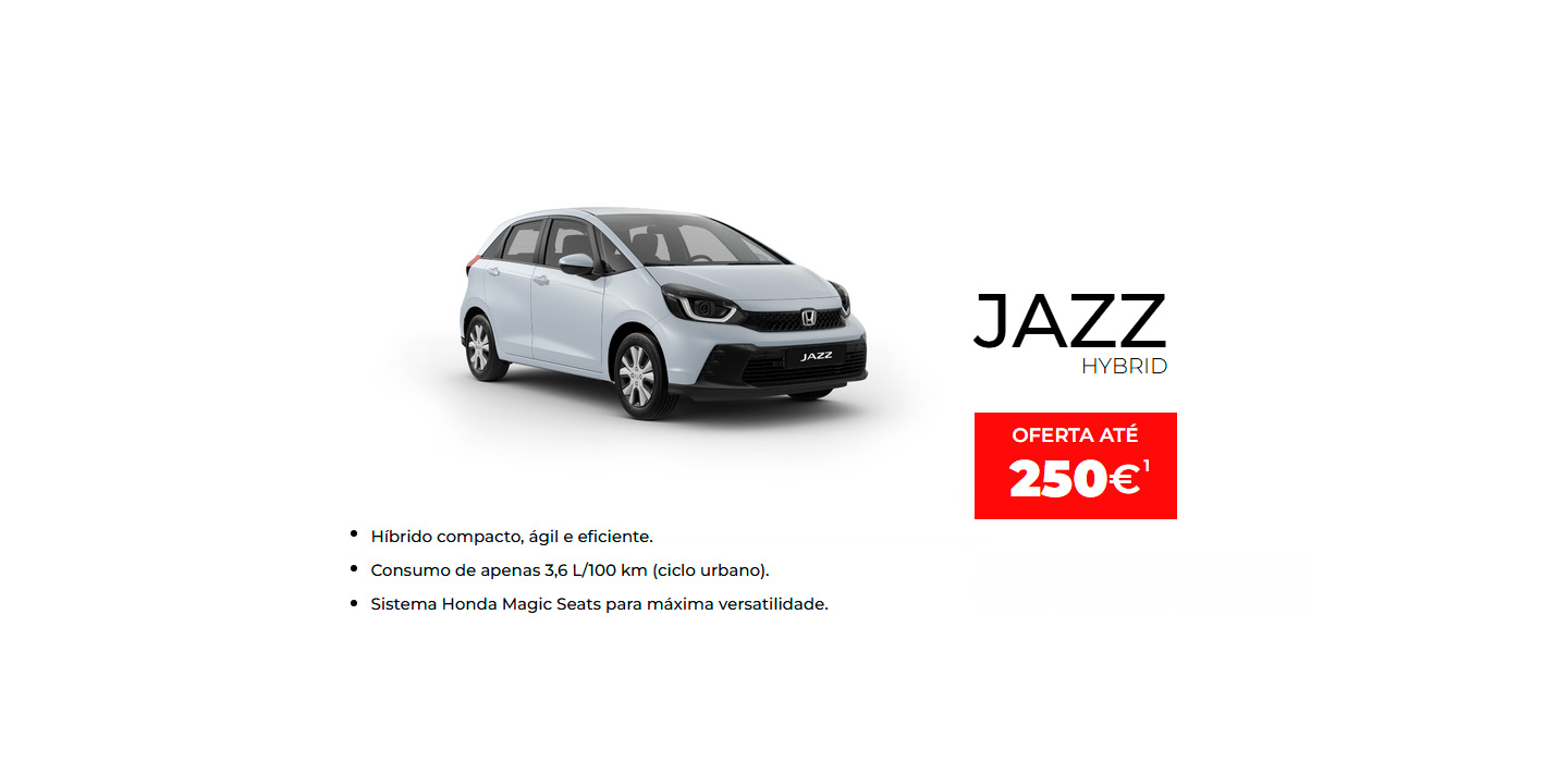 1. Campanha válida para matrículas até 21 de novembro de 2025, nos Concessionários Aderentes, exemplo de oportunidade 250€ para o modelo Jazz Hybrid Elegance (250€ em campanha swapON), limitada às unidades existentes ao arranque da campanha. Válido para clientes particulares registados na plataforma myHONDA. As imagens e equipamentos apresentados são meramente ilustrativos e podem não corresponder às versões em campanha ou comercializadas em Portugal.