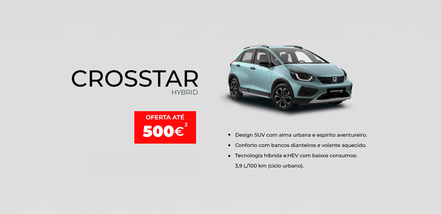 2. Campanha válida para matrículas até 21 de novembro de 2025, nos Concessionários Aderentes, exemplo de oportunidade 500€ para o modelo Jazz Crosstar Hybrid Advance (250€ de desconto direto + 250€ em campanha swapON), limitada às unidades existentes ao arranque da campanha. Válido para clientes particulares registados na plataforma myHONDA. As imagens e equipamentos apresentados são meramente ilustrativos e podem não corresponder às versões em campanha ou comercializadas em Portugal.