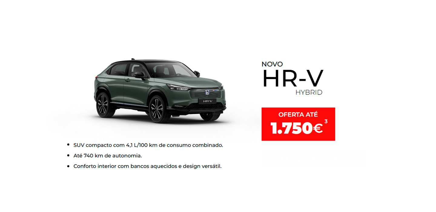 3. Campanha válida para matrículas até 21 de novembro de 2025, nos Concessionários Aderentes, exemplo de oportunidade 1.750€ para o modelo HR-V Hybrid Elegance (1.500€ de desconto direto + 250€ em campanha swapON), limitada às unidades existentes ao arranque da campanha. Válido para clientes particulares registados na plataforma myHONDA. As imagens e equipamentos apresentados são meramente ilustrativos e podem não corresponder às versões em campanha ou comercializadas em Portugal.