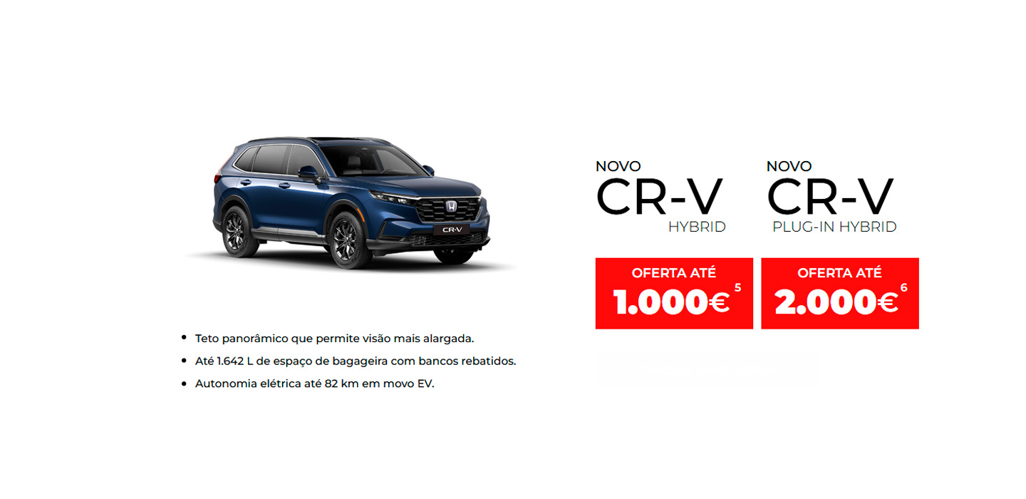 6. Campanha válida para matrículas até 21 de novembro de 2025, nos Concessionários Aderentes, exemplo de oportunidade 1.000€ para o modelo CR-V Hybrid Lifestyle (500€ de desconto direto + 500€ em campanha swapON), limitada às unidades existentes ao arranque da campanha. Válido para clientes particulares registados na plataforma myHONDA. As imagens e equipamentos apresentados são meramente ilustrativos e podem não corresponder às versões em campanha ou comercializadas em Portugal.