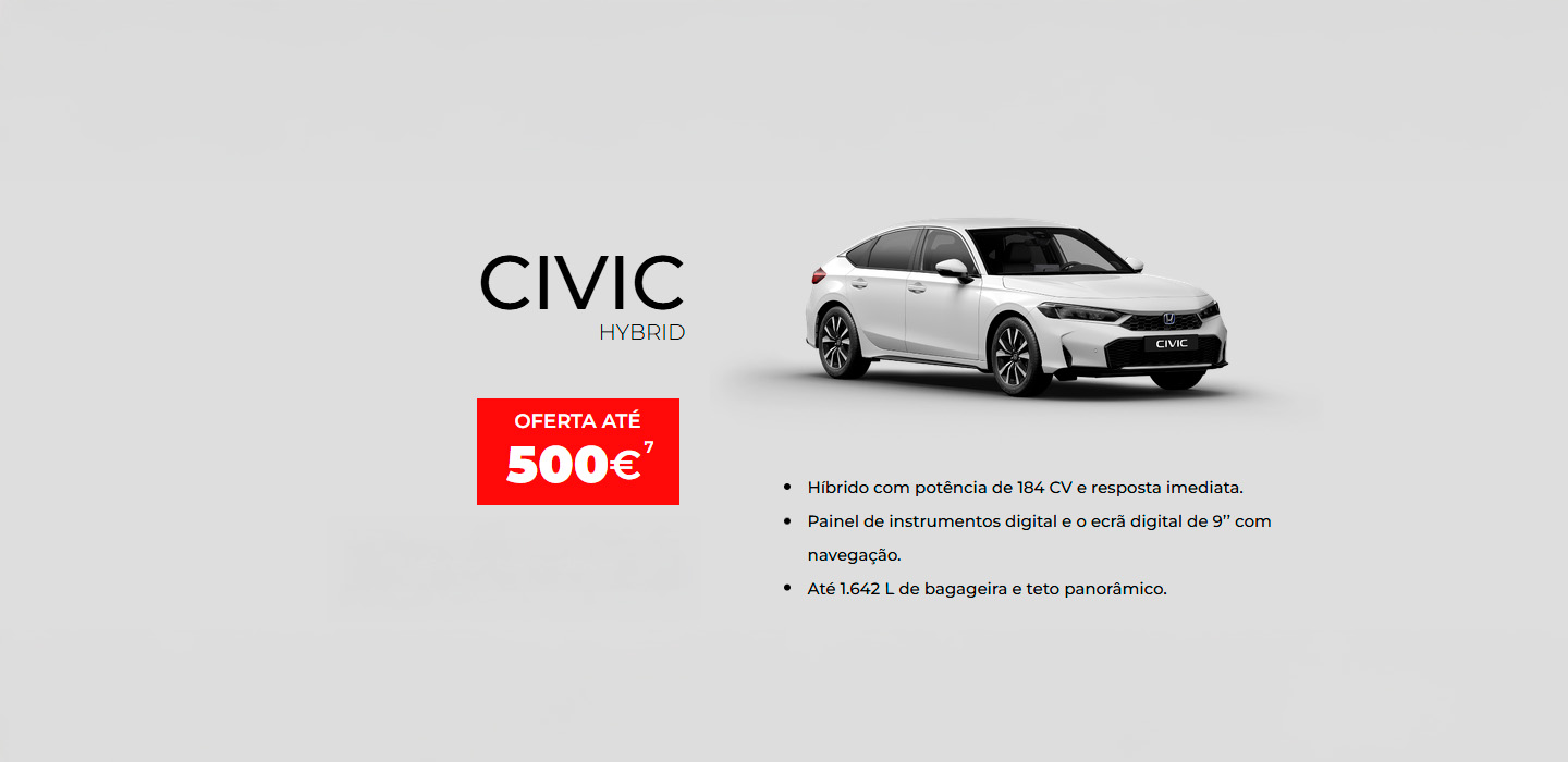 7. Campanha válida para matrículas até 21 de novembro de 2025, nos Concessionários Aderentes, exemplo de oportunidade 500€ para o modelo Civic Hybrid Sport (500€ em campanha swapON), limitada às unidades existentes ao arranque da campanha. Válido para clientes particulares registados na plataforma myHONDA. As imagens e equipamentos apresentados são meramente ilustrativos e podem não corresponder às versões em campanha ou comercializadas em Portugal.
