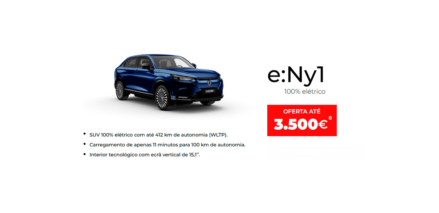 8. Campanha válida para matrículas até 21 de novembro de 2025, nos Concessionários Aderentes, exemplo de oportunidade 3.500€ para o modelo eNy1 (3.000€ de desconto direto + 500€ em campanha swapON), limitada às unidades existentes ao arranque da campanha. Válido para clientes particulares registados na plataforma myHONDA. As imagens e equipamentos apresentados são meramente ilustrativos e podem não corresponder às versões em campanha ou comercializadas em Portugal.