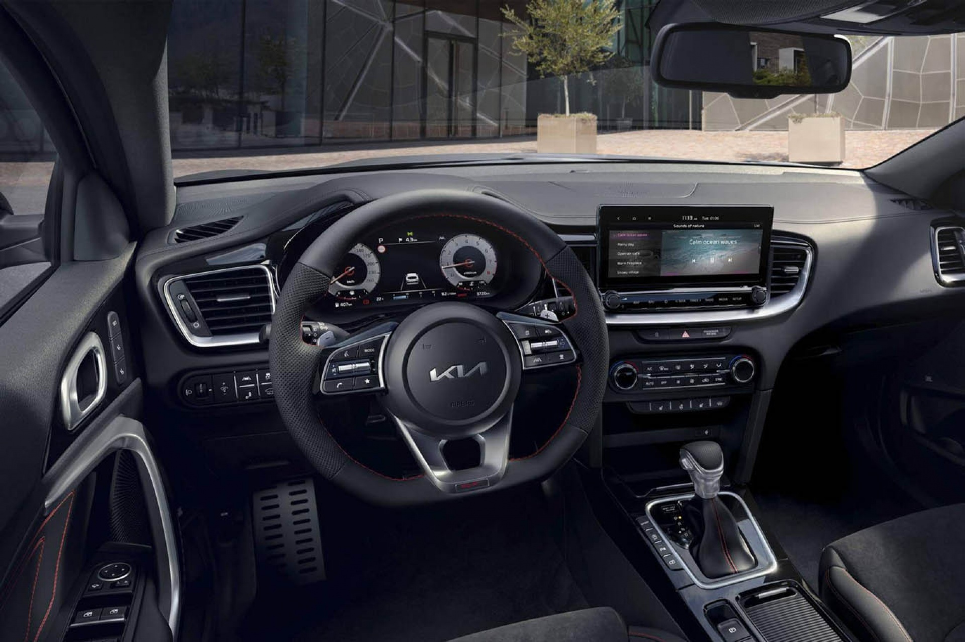 No novo Kia ProCeed, a excitação e a sofisticação são fornecidas em doses iguais, tanto para o condutor como para os passageiros. Entre e receba as boas-vindas por parte de um habitáculo de alta qualidade, onde se destacam os bancos pretos em camurça e couro. Não deixe de reparar na elegante faixa de contraste em camurça ao centro, com pespontos cinzentos na versão GTL ou, na versão GT, com pespontos vermelhos acompanhados por um irresistível dístico com o respetivo logótipo. Uma vez sentado, terá à sua frente um elegante e desportivo volante com formato em D, equipado com patilhas de comando da caixa de velocidades, bem como um tablier onde o ecrã tátil de 8" do sistema de navegação surge perfeitamente integrado. Igualmente digno de destaque é o comando do ar condicionado totalmente automático, que inclui um ecrã digital que apresenta a temperatura a bordo e garante os mais elevados níveis de conforto.