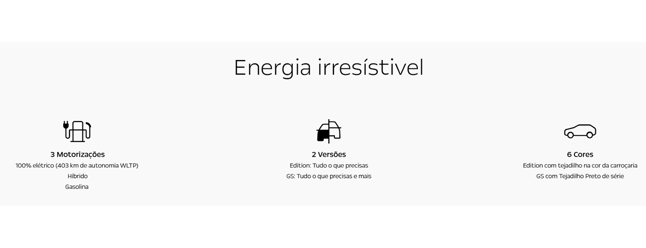 Escolhe entre 100% Elétrico, Híbrido a Gasolina - ou Gasolina normal. Opta pelo 100% Elétrico e vais adorar a potência instantânea com um toque no pedal do acelerador.